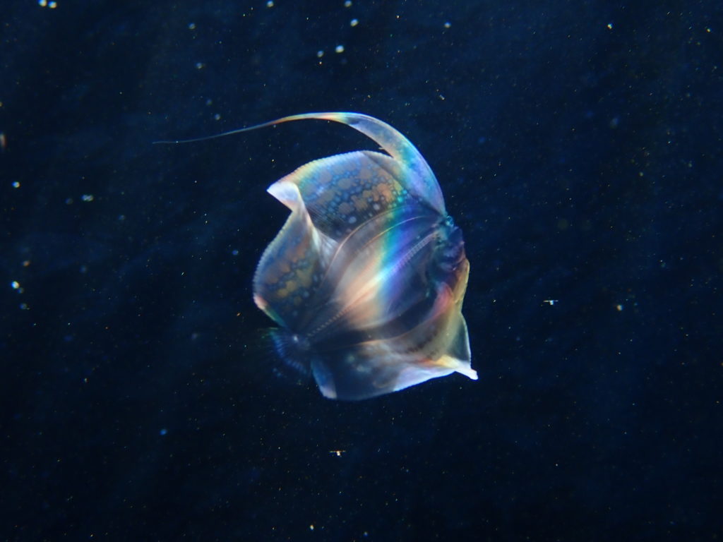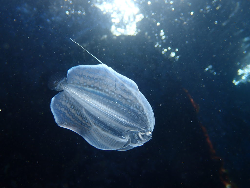 水面近くをひらひら泳ぐスケスケなお魚が泳いでいました。日の光が当たるとものすごくきれいですね。