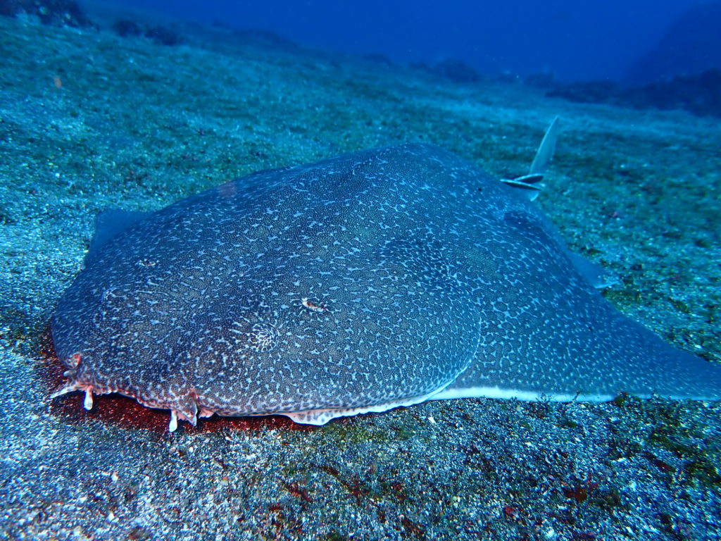 カスザメ 砂地に平べったい体を埋めて、獲物を待ち伏せするハンター。砂に擬態しているため、目だけがキョロリと出ているのを見つけた時は、宝探しに成功したような興奮があります!