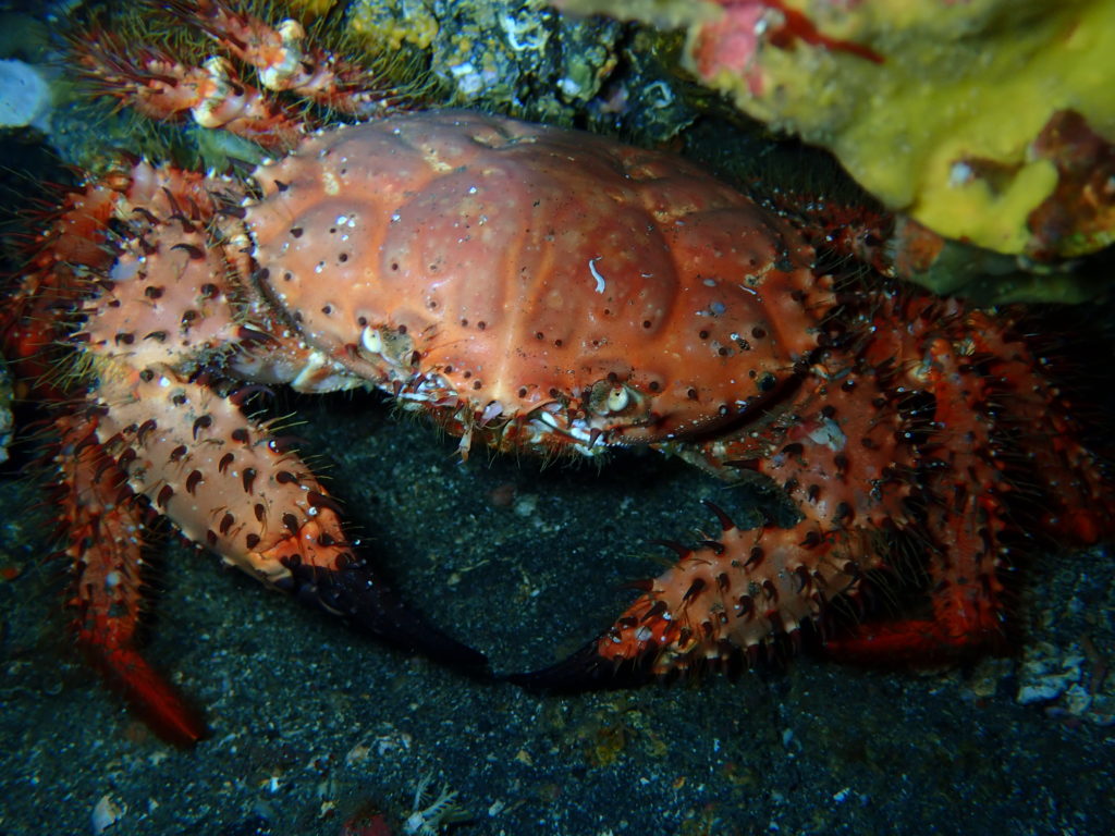 マツバガニ いわゆる松葉ガニとは別種の大型のカニです。海の中での姿は力強く、威厳があります。岩の隙間に潜んでいたり、砂地にいたりと、そのガッシリとした脚のラインは怪獣のようですね。
