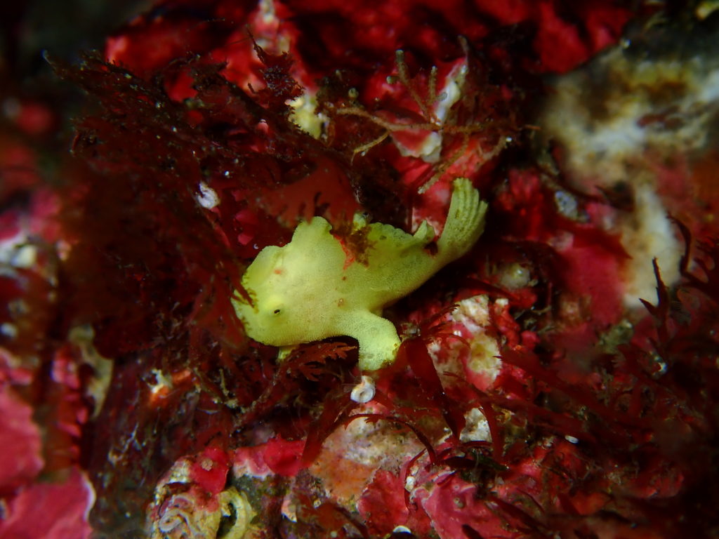 蛍光黄色のイロカエルアンコウyg 「yg(幼魚)」ならではの、まるでおもちゃのような質感!特に蛍光イエローの個体は、暗い岩陰でもパッと光を放つような存在感があります。ちょこんと手のような胸びれで岩を掴む姿は、何度見ても飽きません。