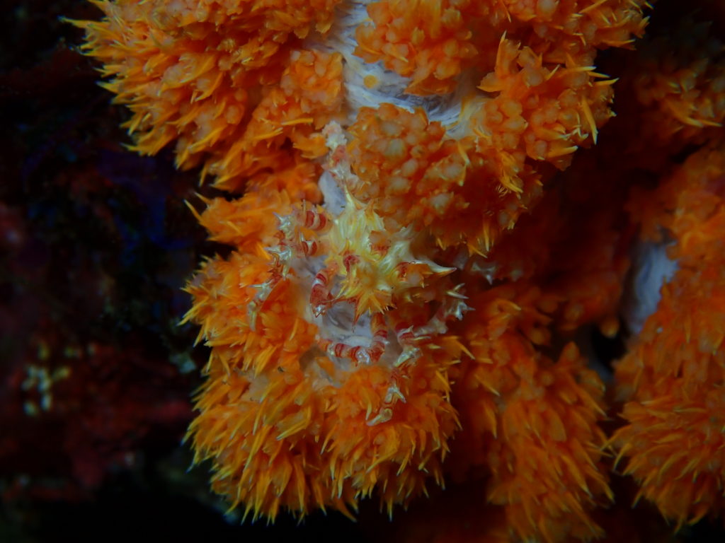 オレンジ色のイソコンペイトウガニ トゲトゲの体が金平糖そっくりなこのカニ。ホストとなるソフトコーラルの色に合わせて体色が変わりますが、鮮やかなオレンジ色の個体は、写真映え間違いなしの美しさです。