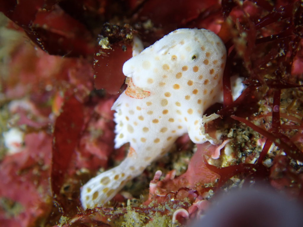 ドット柄のイロカエルアンコウ & オオモンカエルアンコウ まるまるとしたフォルムが愛らしいカエルアンコウ。特にドット柄のイロカエルアンコウは、まるでおもちゃのような可愛らしさ!