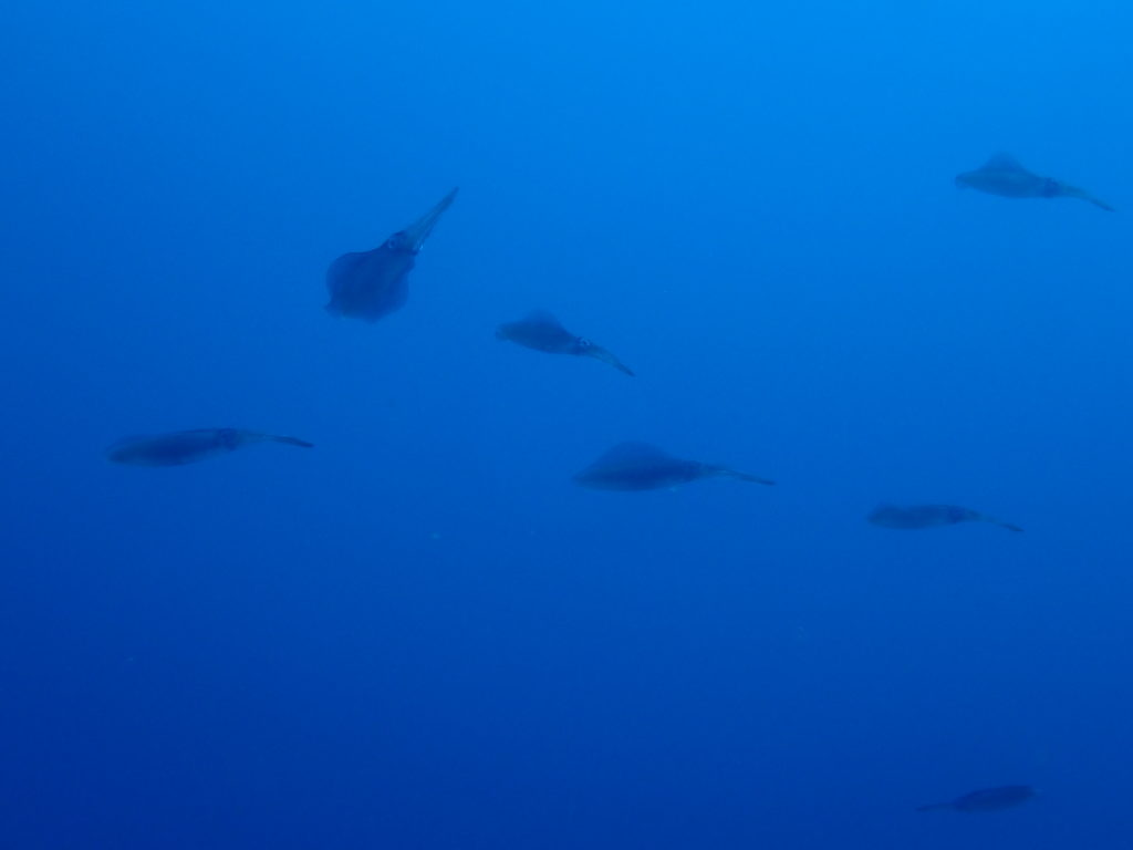 アオリイカの群れ 春から夏にかけて、産卵のために集まるアオリイカの群れは圧巻!半透明の体が光を反射し、整然と並んで泳ぐ姿は神々しささえ感じさせます。