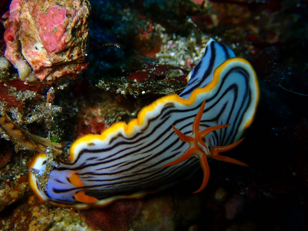 クロスジウミウシ:白地に黒のラインが走る、伊豆大島の定番ながらも気品あふれる姿。