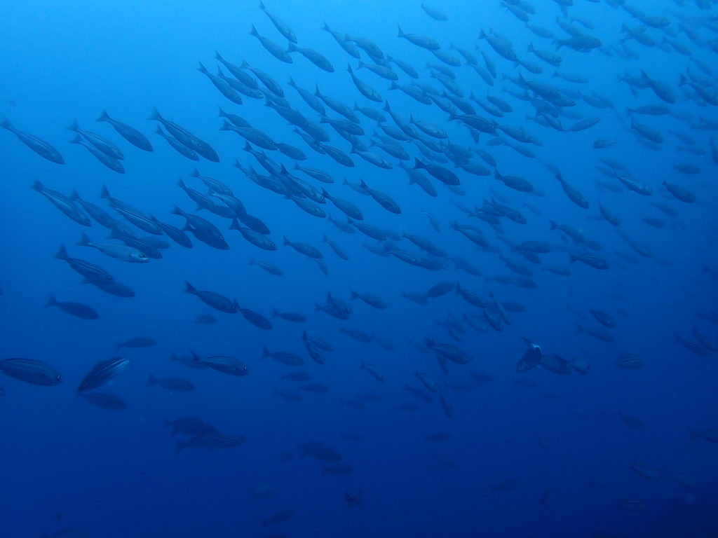正面の根を降りていくと、中層にはイサキの群れが賑やかです。