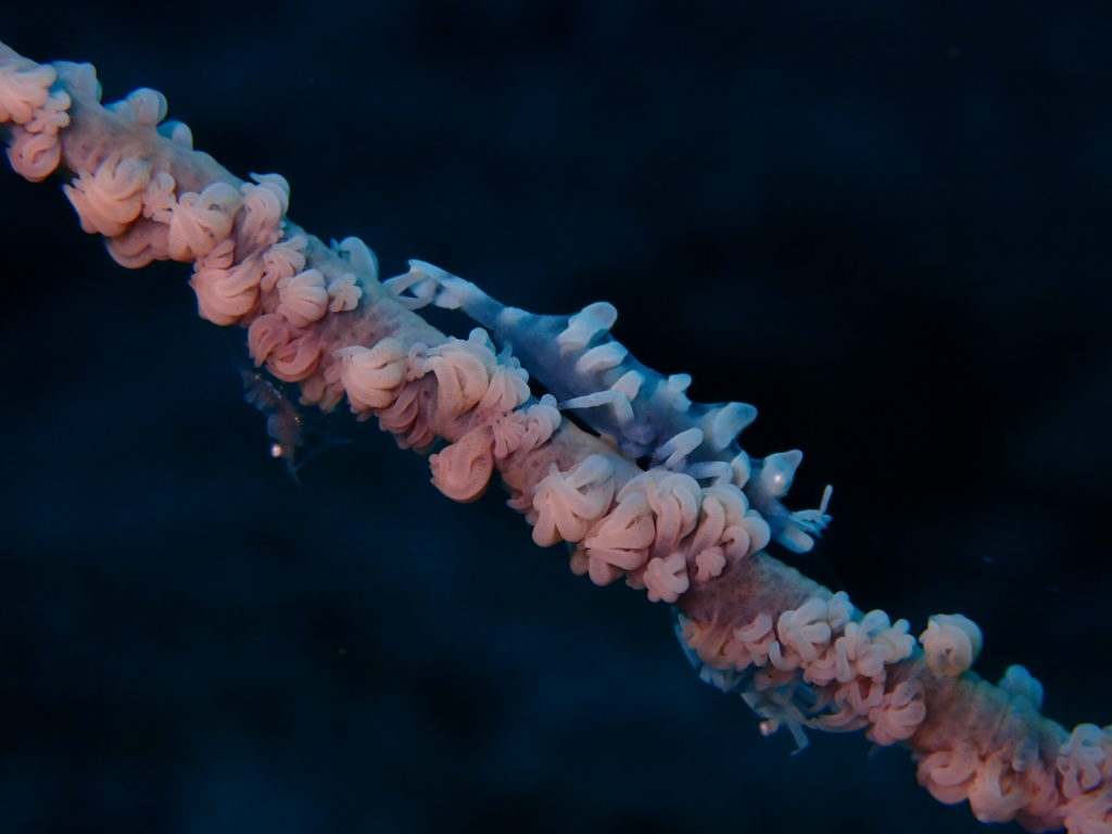 ムチカラマツの共生トリオ: ひとつのムチカラマツに、ビシャモンエビ、ムチカラマツエビ、ガラスハゼが仲良く共生中。